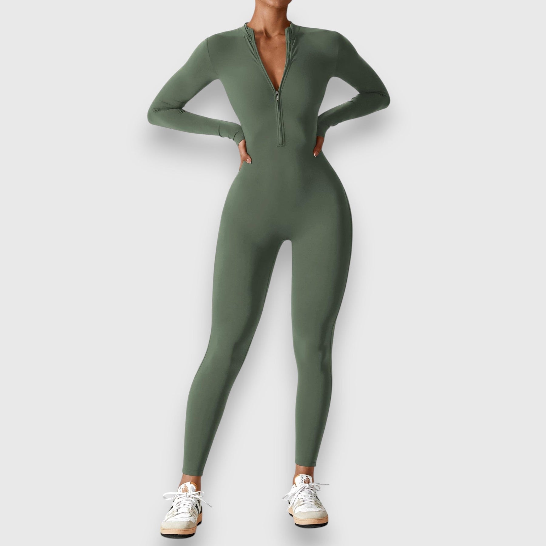 Korkea kaulus ja käytännöllinen vetoketju tekevät tästä puvusta täydellisen valinnan jokaiseen tilaisuuteen.