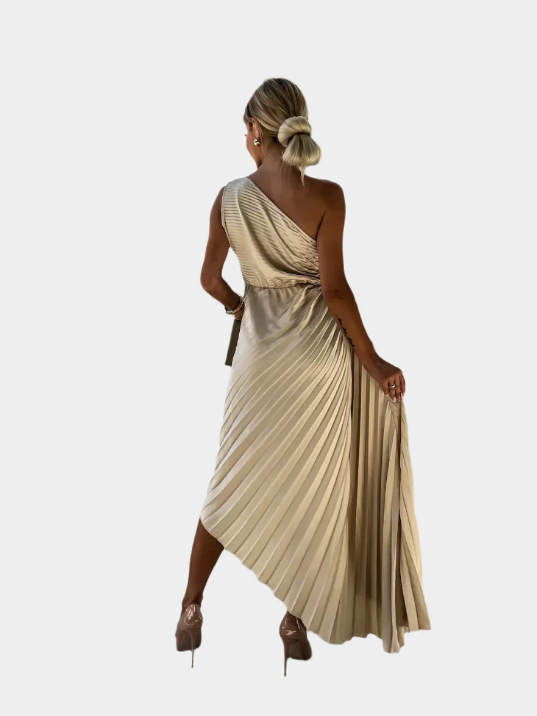 Epäsymmetrinen leikkaus ja plissee-hame luovat virtaavaa liikettä ja hienostunutta linjaa, joka korostaa siluettia.