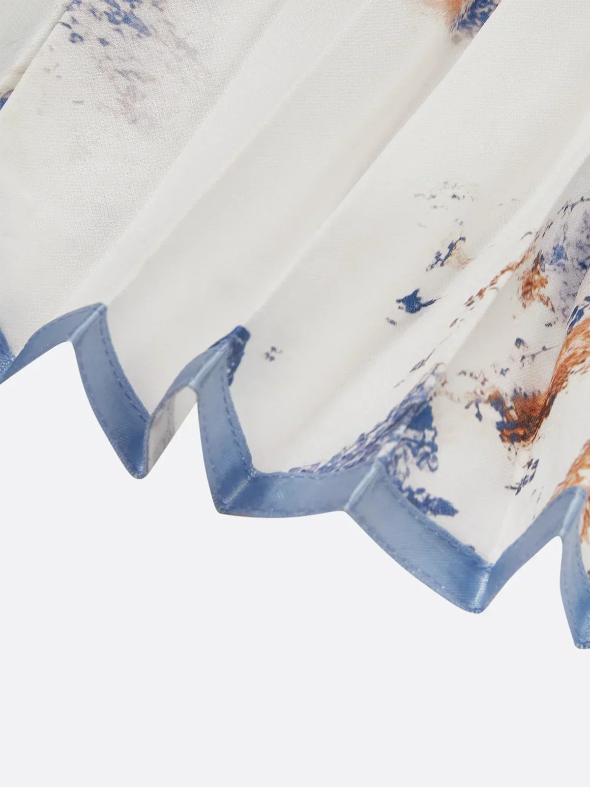 Syvä pääntie ja kevyt pliseerattu pinta tekevät tästä mekosta naisellisuuden huipentuman. Hienovarainen kukkakuosi tarjoaa ilmavaa liikettä ja aristokraattista tyyliä, täydentäen jokaisen askeleen eleganssia.
