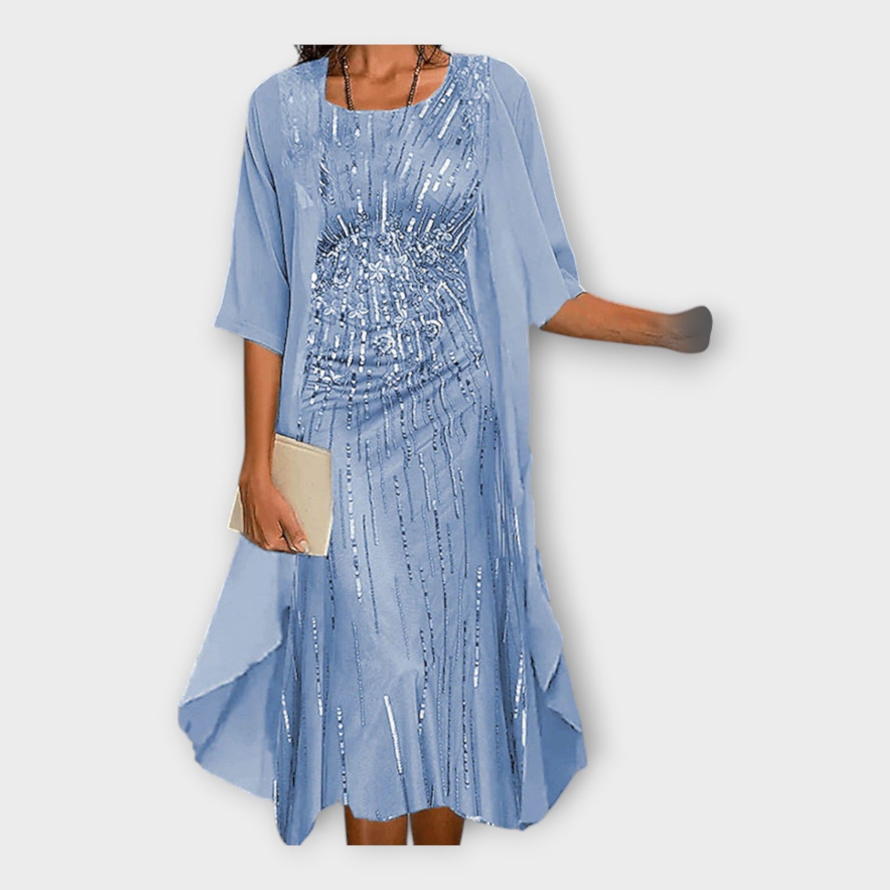 Tämä upea mekko yhteensopivalla neuletakilla on täydellinen valinta jokaiseen tilaisuuteen. Sen ilmava istuvuus tarjoaa liikkumisvapautta, kun taas vaikuttavat kuviot lisäävät naisellisuutta. Neuletakki, joka on yhteensopivassa värissä, tuo eleganssia ja peittävyyttä. Valmistettu pehmeästä, hengittävästä kankaasta, tämä asu sopii kaikkiin vuodenaikoihin.